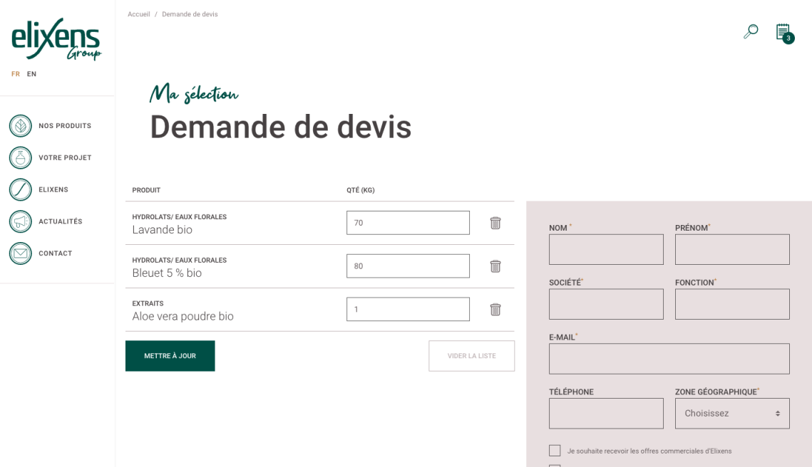 L’internaute peut réaliser ses demandes de devis directement depuis le site web. Le fonctionnement est similaire à un site ecommerce, les clients ajoutent à leur panier les produits d’Elixens et effectuent la demande de prix aux équipes commerciales.